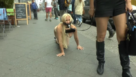 Mona Wales dislikes nothing more than dirty streets and clean submissives. This morning Mona decides to take matters into her own hands and take her beautiful blonde cum whore out to clean the streets of Berlin. The site of the humiliated Celina Davis crawling along the sidewalk is a welcome distraction to the morning commuters. Men in suits stop and admire Celina’s exposed milky ass, pink pussy and spread asshole. As Mona’s human street sweeper crawls to get all the trash, her heavy tits brush against the filthy sidewalk. Once Mona is satisfied that she has done her public service for the day, she takes Celina’s whore holes to be fill at a local bar. Once in the bar Mona opens her slut up to be used. With an ashtray in her mouth Celina’s pussy is packed of cock with a double vaginal penetration. After Celina’s holes have been completely used up the bar patrons toss their cigaret buts, ash and cum all over her face and perky tits. Thank you Mona for doing your part to make Berlin a cleaner and happier place.